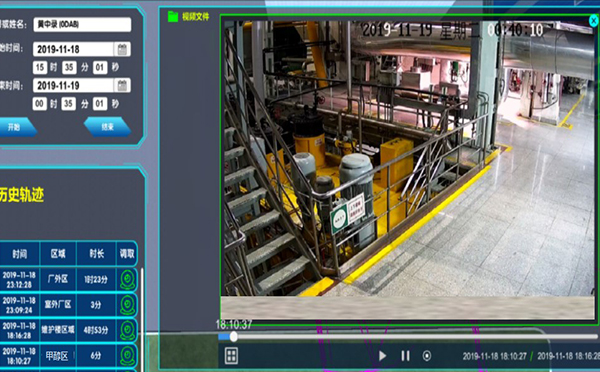 5.歷史軌跡查詢:歷史軌跡由人員行走的路線軌跡和進出各區域及各建筑物的歷史時間列表構成,可聯動對應的歷史時間段的視頻監控一起播放,視頻監控畫面可按1/4/9/16四種不同的宮格進行顯示,全方位還原當時的真實情況。